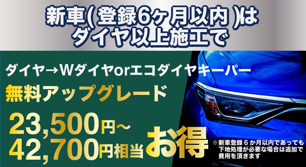 | 特徴 | レジン被膜に、高密度ガラス皮膜を二層重ねた、三重構造。 ダイヤモンドキーパー同様に空気乾燥させつつ、厚いガラスの層が2倍あることで、ツヤや汚れにくさが更にアップ。 もちろん水シミ、紫外線もしっかりガード。 |